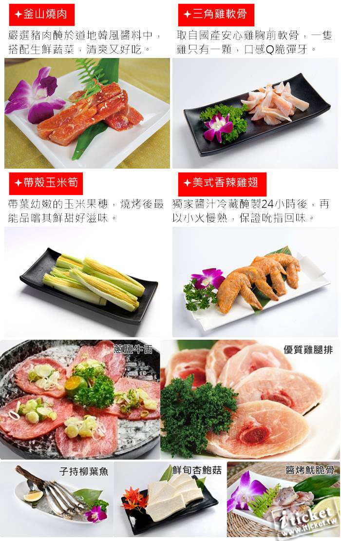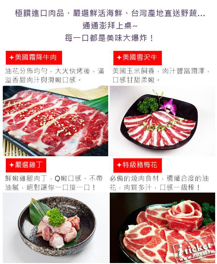 2.餐點內容:蔥鹽牛舌 + 美國霜降牛肉 + 美國雪沢牛 + 牛肉起士捲+ 特級豬梅花 + 嚴選霜降豚 + 釜山燒肉 + 懷舊小洋腸+ ﹝雞肉盛合:三角雞軟骨 + 嚴選雞丁 + 美式香辣雞翅 + 優質雞腿排﹞ +﹝ 海鮮盛合:子持柳葉魚 + 醬烤魷脆骨 + 炙燒魴魚 + 深海中卷足 ﹞+ ﹝綜合蔬菜:帶殼玉米筍 + 鮮旬杏鮑菇﹞ 以上各壹份 + 和風鮮蔬沙拉4份 + 脆皮雪糕4份 + 各式風味飯、無酒精飲料、香醇人氣雞湯無限續點★以上餐點內容如有變動,將提供等值餐點替換。