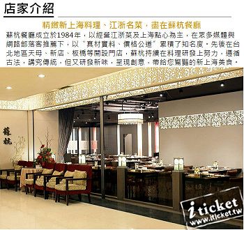 蘇杭餐廳-成立於1984年,以經營江浙菜及上海點心為主,在眾多媒體與網路部落客的推薦下,以〝真材實料、價格公道〞累積了知名度。先後在台北區域開設門店,蘇杭持續在料理研發上努力,近幾年在海外觀摩學習,及人才培育上投入許多資源,累積在江浙料理的經驗,一步一腳印的經營與技術上的提升,期許成為台灣新上海菜的代表,未來將持續把美味的料理帶給更多喜歡美食的消費者,並為提升台灣餐飲服務業盡一份心力。●江浙名菜研發新味,呈現驚豔的新上海美食