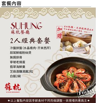 1.本券可2人於蘇杭餐廳適用分店享用經典套餐乙客。 (已含服務費)