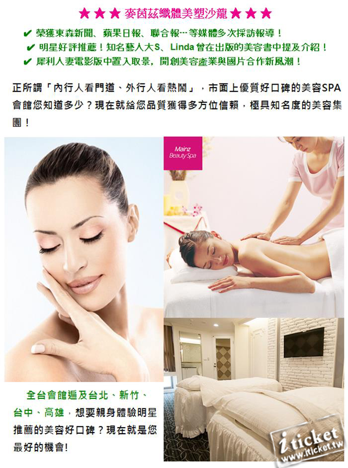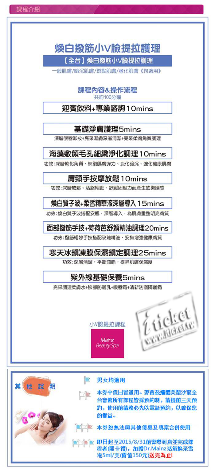 1.本券可單人(男女適用)於麥茵茲纖體美塑沙龍使用「煥白撥筋小V臉提拉護」課程乙次,約100分鐘。