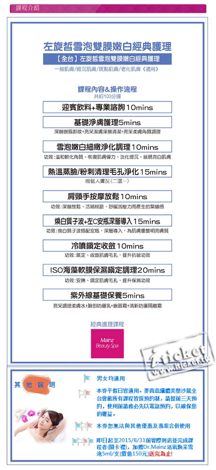 1.本券可單人(男女適用)於麥茵茲纖體美塑沙龍使用「左旋皙雪泡雙膜嫩白經典臉部護理」課程乙次,約100分鐘。