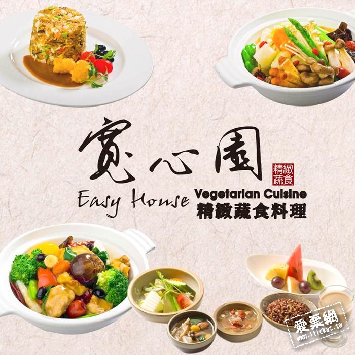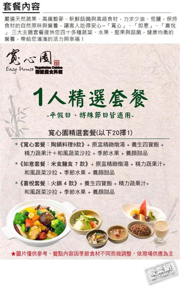 1.單張可1人於寬心園精緻蔬食料理餐廳享用精選套餐乙客(已含服務費)。