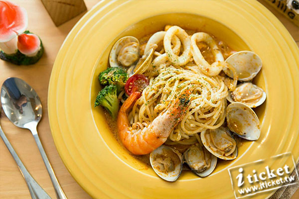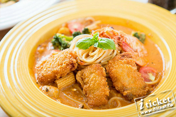 主餐:粉紅辣醬鮮蝦魚/泰式酸辣麵(雞or海鮮)/蕃茄紅醬豬排麵/泰式酸辣嫩雞焗烤麵(or海鮮),