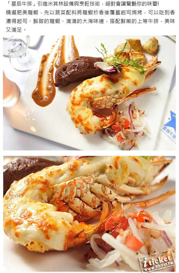 主菜:◎法式焗龍蝦(半隻)+星辰經典牛排12oz;◎法式焗龍蝦(半隻)+頂級鮮干貝+香煎多利魚 二選一。