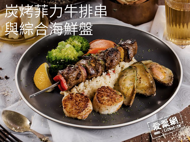 2. 主菜可加價100元升級下列餐點二擇一(炭烤菲力牛排串與綜合海鮮盤、炭烤挪威野生鮭魚排)。