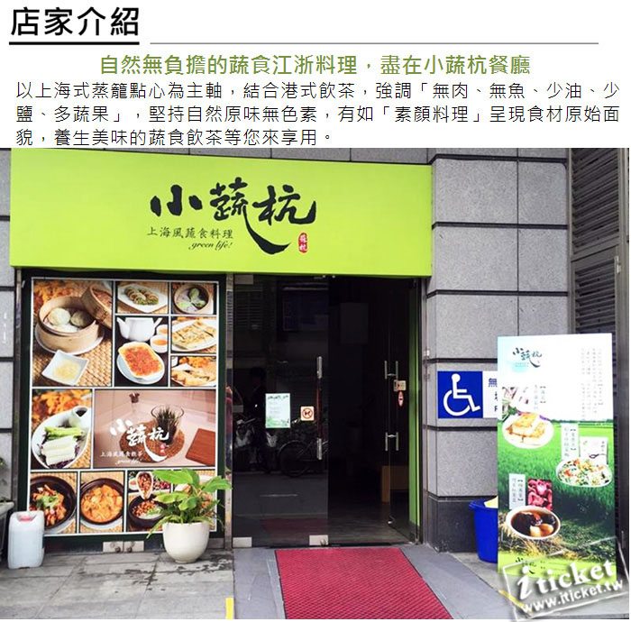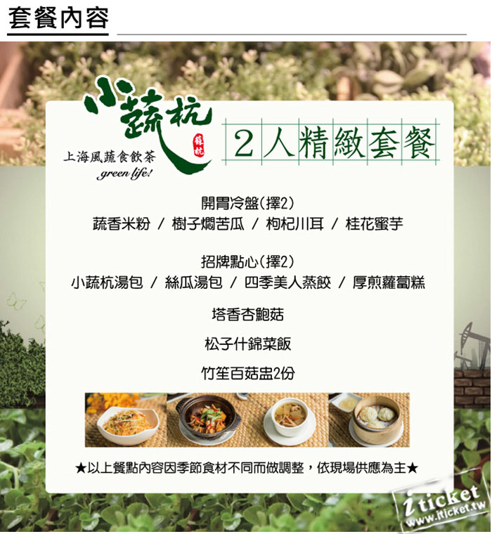 1.本券可2人於小蔬杭上海風蔬食飲茶享用精緻套餐乙客。 (已含服務費)