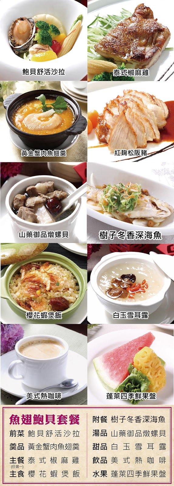 2. 套餐內容:主餐二選一(紅麴松阪豬/泰式椒麻雞),鮑貝舒活沙拉x1,黃金蟹肉魚翅羹x1,樹子冬香深海魚 x1,櫻花蝦煲飯x1,山藥御品燉螺貝x1,蓬萊四季鮮果盤x1白玉雪耳露x1,美式熱咖啡x1。