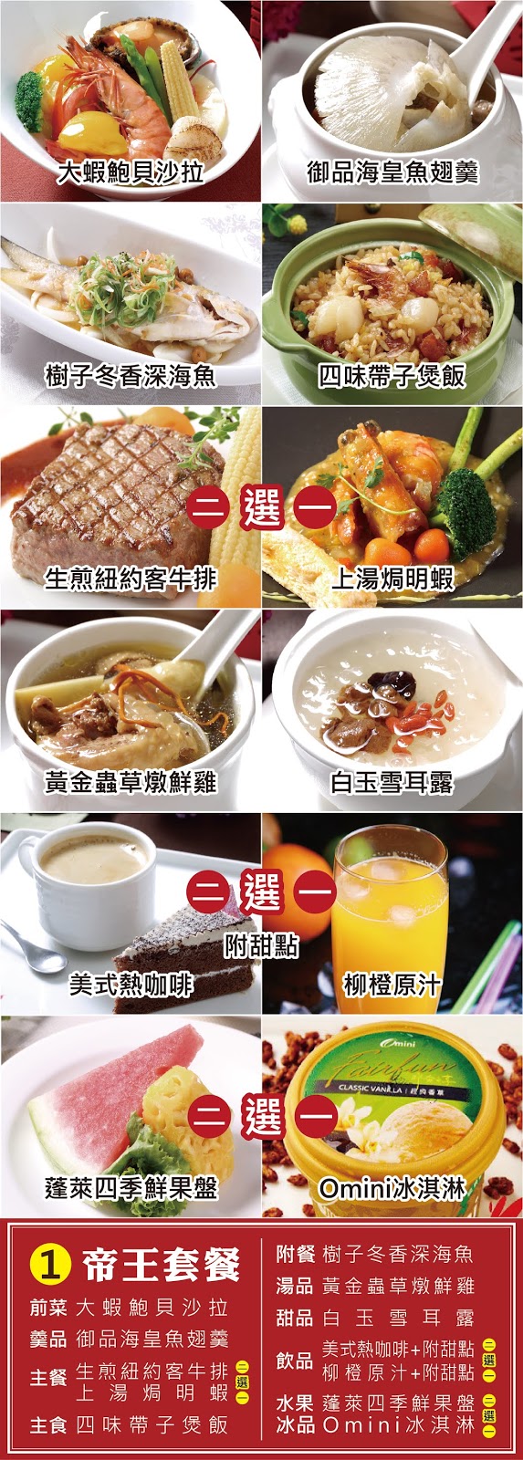 2. 套餐內容:主餐二選一(生煎紐約客牛排/上湯焗明蝦),大蝦鮑貝沙拉x1,御品海皇魚翅羹x1,樹子冬香深海魚x1,四味帶子煲飯x1,黃金蟲草燉鮮雞x1,白玉雪耳露x1,美式熱咖啡or柳橙原汁x1,蓬萊四季鮮果盤 or Omini冰淇淋x1。