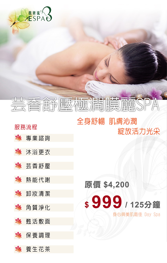 1. 憑券可享馥妍流ESPA-單人芸香舒壓極潤膜麗SPA 125分鐘護理乙次。