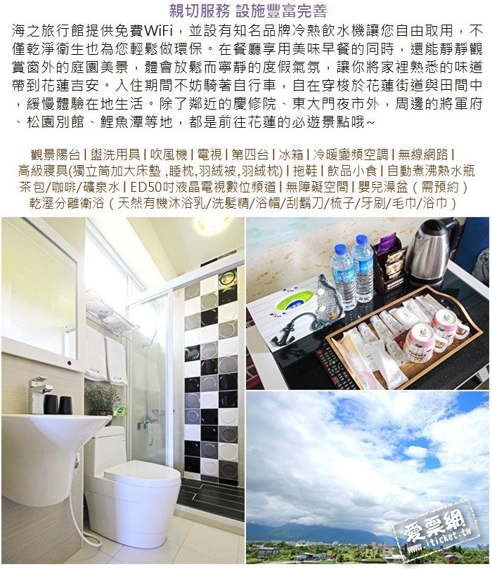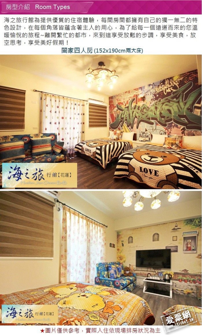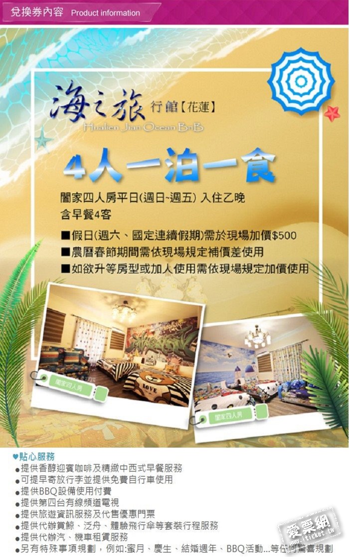 1.單張可4人於海之旅行館入住闔家四人房乙晚,含4客早餐。