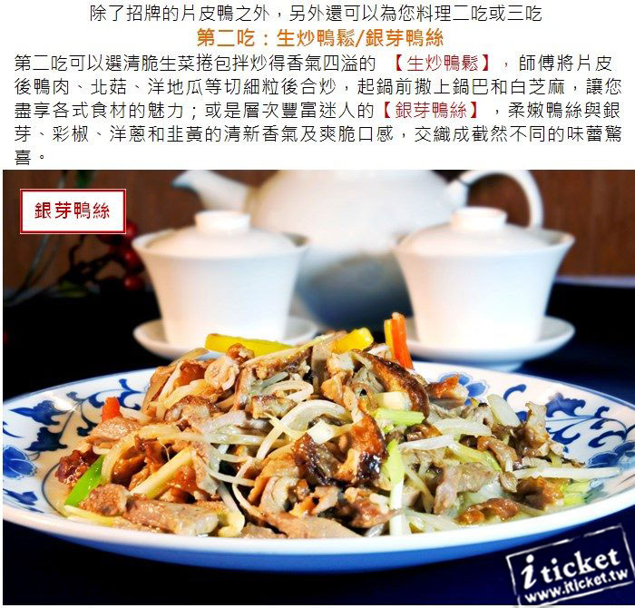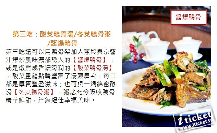 (烤鴨料理多種吃法:片皮/生炒鴨鬆or銀芽鴨絲/酸菜鴨骨湯or冬菜鴨骨粥or醬爆鴨骨)