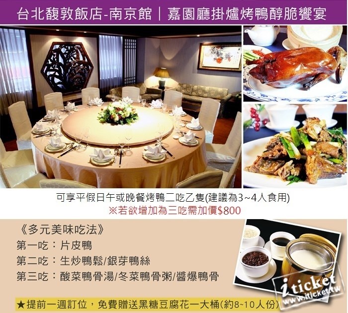 1.本券可於台北馥敦飯店南京館《嘉園廳》享烤鴨二吃(原價$1760)乙隻。