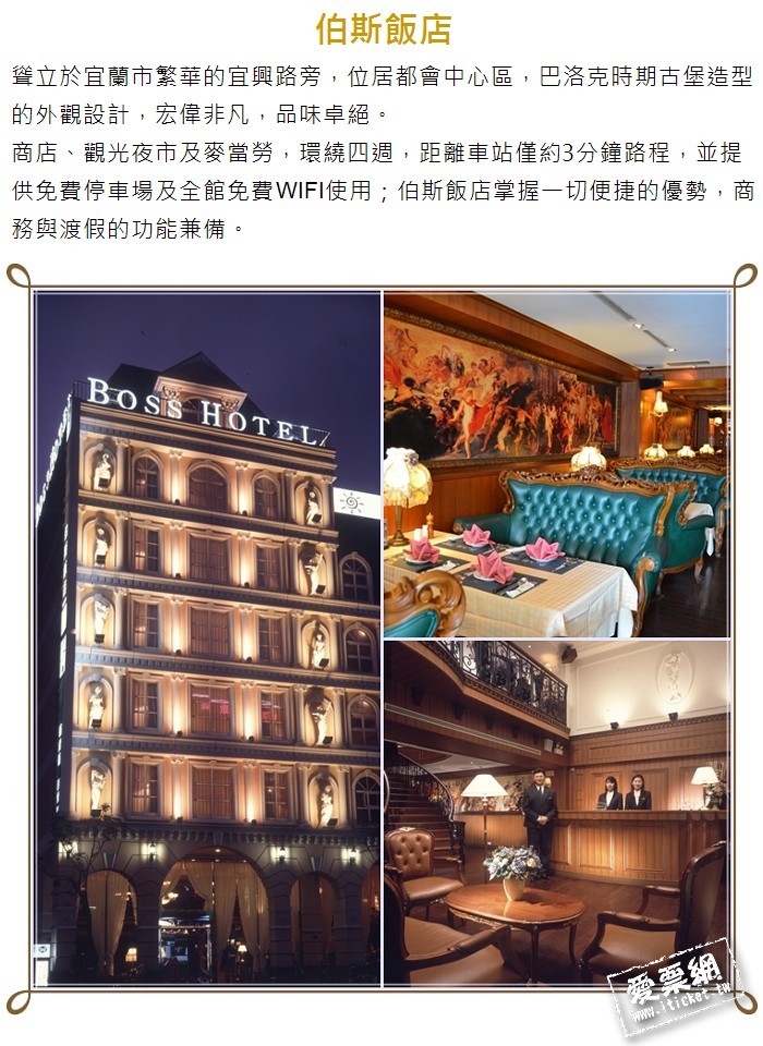 宜蘭 伯斯飯店-聳立於宜蘭市繁華的宜興路旁,位居都會中心區,巴洛克時期古堡造型的外觀設計,宏偉非凡,品味卓絕。商店、觀光夜市及麥當勞,環繞四週,距離車站僅約3分鐘路程,並提供免費停車場及寬頻無限網路;伯斯飯店掌握一切便捷的優勢,商務與渡假的功能兼備。文藝復興風格的彩繪壁畫、仿古歐洲情懷的燈飾及桌椅、迴旋而上的弧形階梯、撩人遐思的法國香頌。