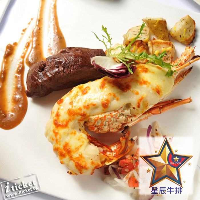 主菜:◎法式焗龍蝦(半隻)+星辰經典牛排12oz;◎法式焗龍蝦(半隻)+頂級鮮干貝+香煎多利魚 二選一。