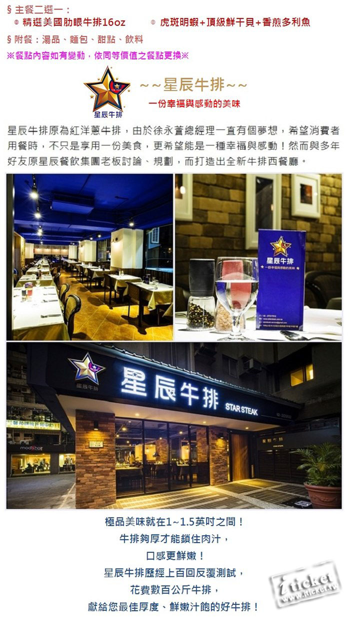 星辰牛排原為紅洋蔥牛排,由於徐永蒼總經理一直有個夢想,希望消費者用餐時,不只是享用一份美食,更希望能是一種幸福與感動!然而與多年好友原星辰餐飲集團老板討論、規劃,而打造出全新牛排西餐廳。引進米其林設備與烹飪技術,絕對會讓驚艷你的味蕾!一份幸福與感動的美味~ 極品美味就在1~1.5英吋之間!牛排夠厚才能鎖住肉汁,口感更鮮嫩!星辰牛排歷經上百回反覆測試,花費數百公斤牛排,獻給您最佳厚度、鮮嫩汁飽的好牛排!