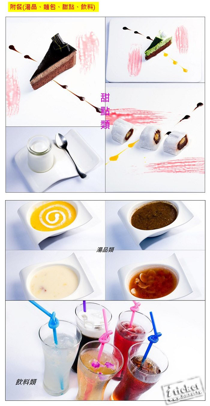 附餐:湯品、麵包、甜點、飲料(餐點內容如有變動,依同等價值之餐點更換)。