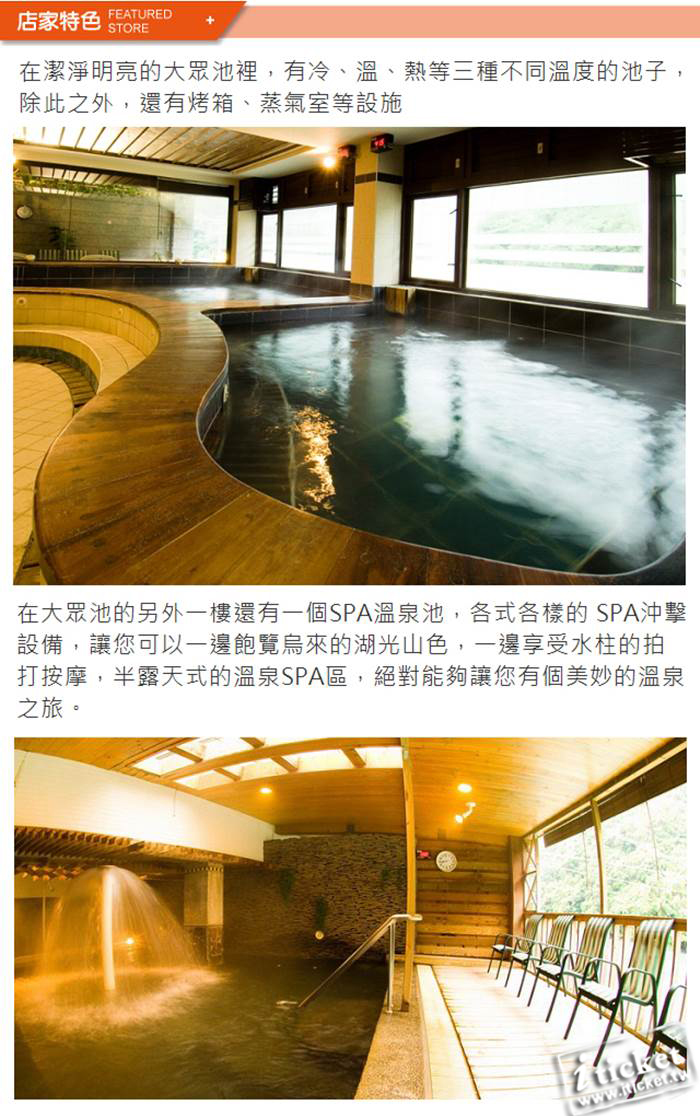 在潔淨明亮的大眾池裡,有冷、溫、熱等三種不同溫度的池子,除此之外,還有烤箱、蒸氣室等設施;為了提供愛美女性一個美容養生的場所,在女大眾池裡還有一 個美膚SPA區,讓您可以享受一個從上到下、從裡到外的SPA按摩,不過這一區可是要另行收費的。在大眾池的另外一樓還有一個SPA溫泉池,各式各樣的 SPA沖擊設備,讓您可以一邊飽覽烏來的湖光山色,一邊享受水柱的拍打按摩,半露天式的溫泉SPA區,絕對能夠讓您有個美妙的溫泉之旅。