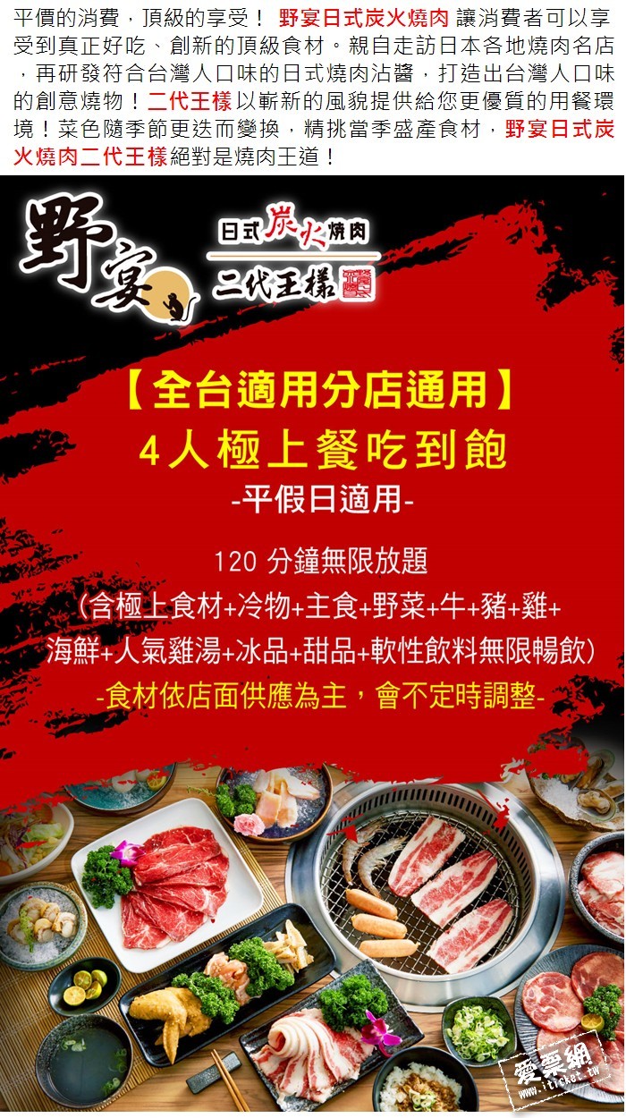 1.本券可4人於《野宴日式炭火燒肉二代店》適用分店享用極上餐吃到飽(僅限內用,已含服務費,部分店家不適用)。