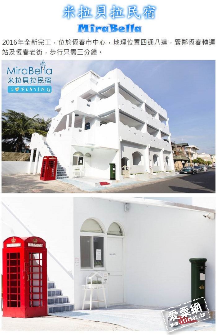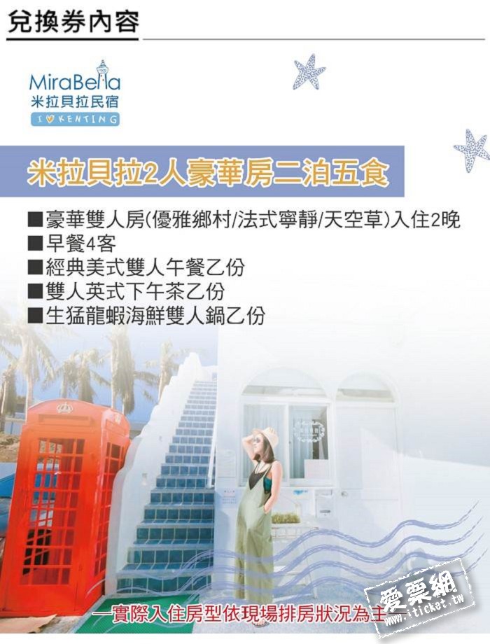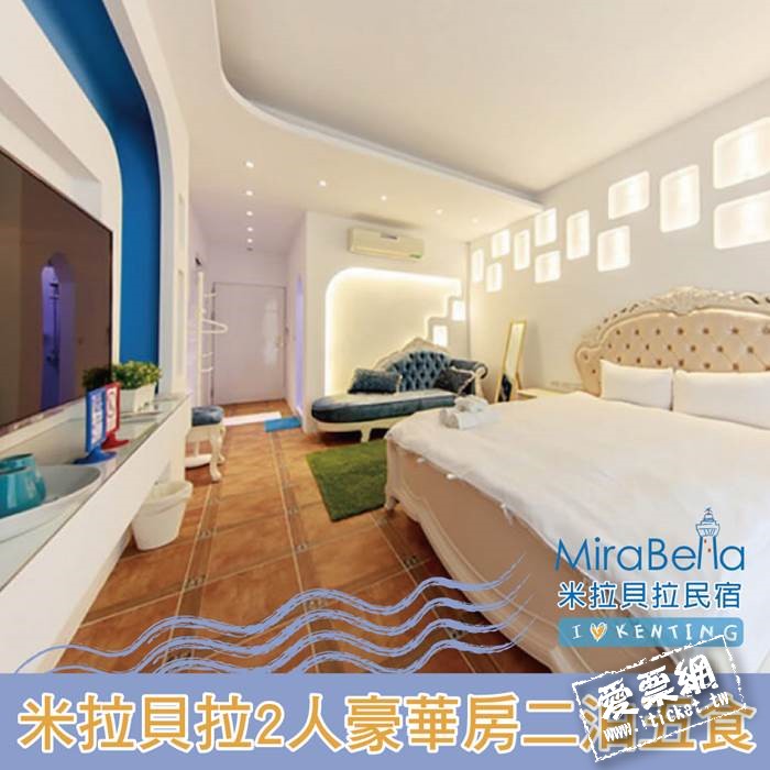 1.單張可2人於墾丁米拉貝拉民宿入住豪華雙人房(優雅鄉村/法式寧靜/天空草)2晚,含2日的雙人早餐、經典美式雙人午餐1份、雙人英式下午茶1份、生猛龍蝦海鮮雙人鍋1份。(實際入住房型依現場排房狀況為主) 。