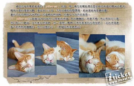 台東民宿小黃貓民宿滿足您享受異國風情的「yellow cat」民宿,是一棟位在那魯灣五星級飯店對面的雙併式豪宅,擁有古堡的建築外觀,建坪共128坪,不受打擾的別野環境,前後面皆有景觀庭院,讓你可在優閒的午後啜飲一杯溫暖的咖啡,欣賞戶外自然的美景。台東yellow cat(小黃貓)名字的由來,它是隻流浪貓,長的醜醜的,其貌不揚,所以我叫它小黃,但它貼心又聽話,本來養在民宿裏,但...真是災難啊!它把我每每的沙發給毀了,從此民宿裏,看不到我那隻醜醜的,但又口愛的它。(被我關在家裏罰站)