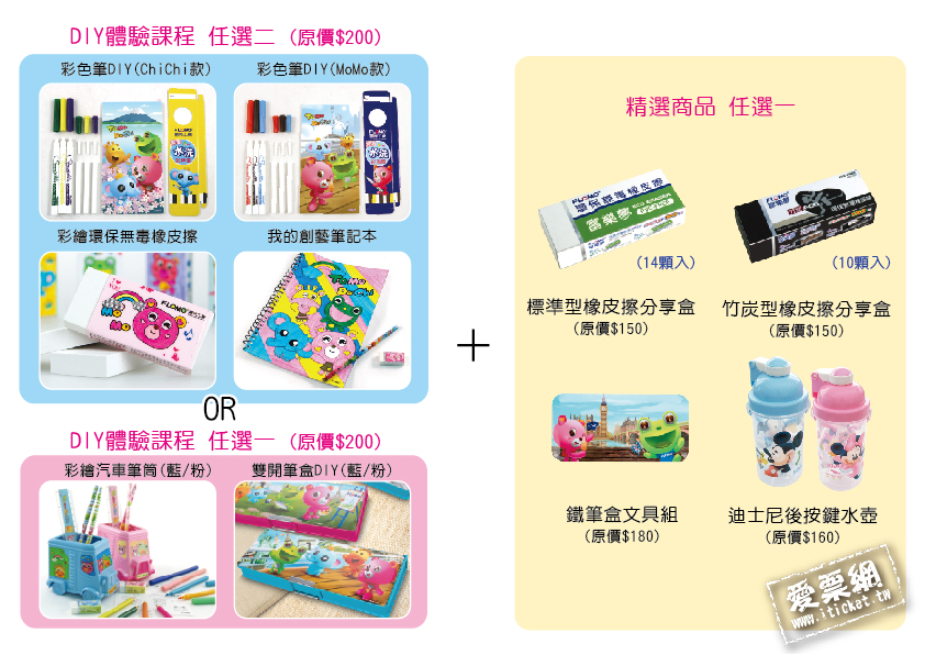 內含三人免門票入場+100元DIY課程任選一堂(彩繪汽車筆筒、雙開筆盒擇1)或 50元DIY課程任選二堂(彩色筆DIY、創藝筆記本、彩繪橡皮擦紙捲擇2)+精選商品任選一項(橡皮擦分享盒、鐵筆盒文具組、可愛水壺擇1)