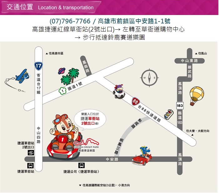 日本鈴鹿賽車場SUZUKA CIRCUIT唯一海外授權的「鈴鹿賽道樂園」,交通非常便利,從高雄捷運草衙站2號出口出站後,就會看到草衙道購物中心,再往裡面走就到鈴鹿賽道樂園了,匯集了shopping、餐飲、運動、娛樂、親子、休閒、度假…等歡樂元素,讓你從早到晚忘卻煩憂,盡情歡樂~無論是親子同遊或是好友情侶,都能玩上一整天捨不得離開! ●日本鈴鹿賽車場SUZUKA CIRCUIT唯一海外授權 ●平假日皆可使用,挑戰專業車手競速快感 ●高雄捷運草衙站2號出口,緊鄰草衙道購物中心
