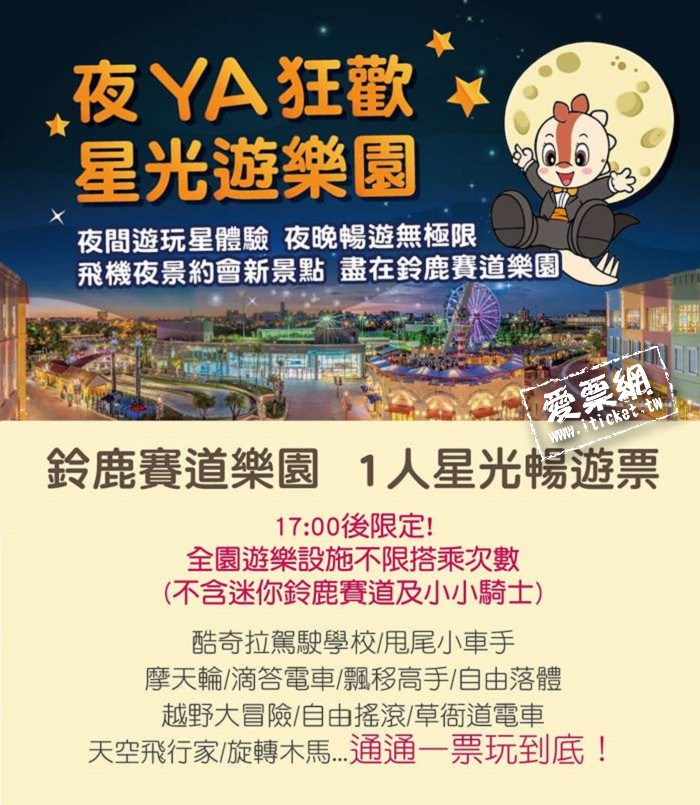 2.請持本券於17:00後至園區售票中心人工櫃台兌換暢遊手環,憑手環可享全園遊樂設施不限搭乘次數(不含迷你鈴鹿賽道及小小騎士)。