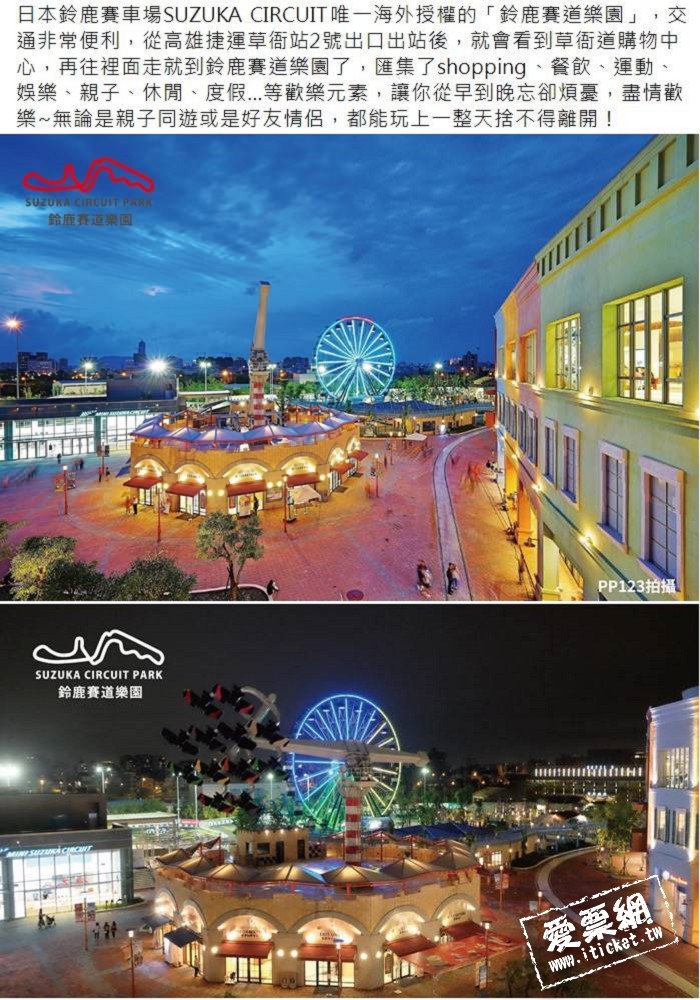 日本鈴鹿賽車場SUZUKA CIRCUIT唯一海外授權的「鈴鹿賽道樂園」,交通非常便利,從高雄捷運草衙站2號出口出站後,就會看到草衙道購物中心,再往裡面走就到鈴鹿賽道樂園了,匯集了shopping、餐飲、運動、娛樂、親子、休閒、度假…等歡樂元素,讓你從早到晚忘卻煩憂,盡情歡樂~無論是親子同遊或是好友情侶,都能玩上一整天捨不得離開!