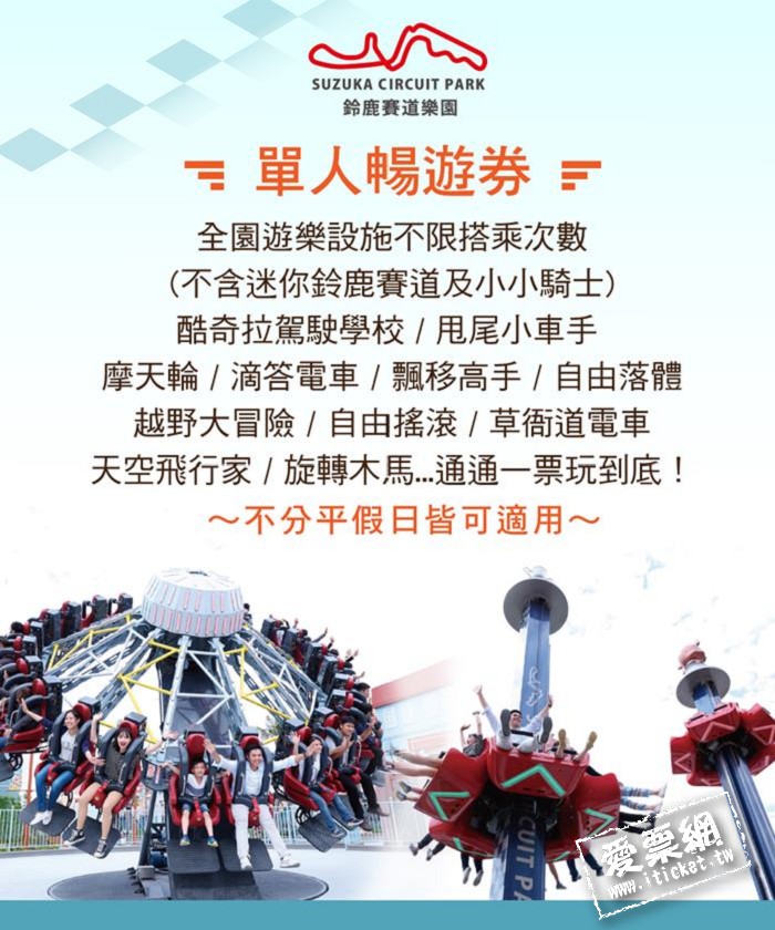 1.單張適用於鈴鹿賽道樂園,每券限1人使用。