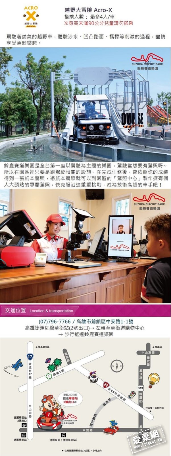 日本鈴鹿賽車場SUZUKA CIRCUIT唯一海外授權的「鈴鹿賽道樂園」,交通非常便利,從高雄捷運草衙站2號出口出站後,就會看到草衙道購物中心,再往裡面走就到鈴鹿賽道樂園了,匯集了shopping、餐飲、運動、娛樂、親子、休閒、度假…等歡樂元素,讓你從早到晚忘卻煩憂,盡情歡樂~無論是親子同遊或是好友情侶,都能玩上一整天捨不得離開! ●日本鈴鹿賽車場SUZUKA CIRCUIT唯一海外授權 ●平假日皆可使用,不限搭乘次數(不含迷你鈴鹿賽道及小小騎士) ●高雄捷運草衙站2號出口,緊鄰草衙道購物中心