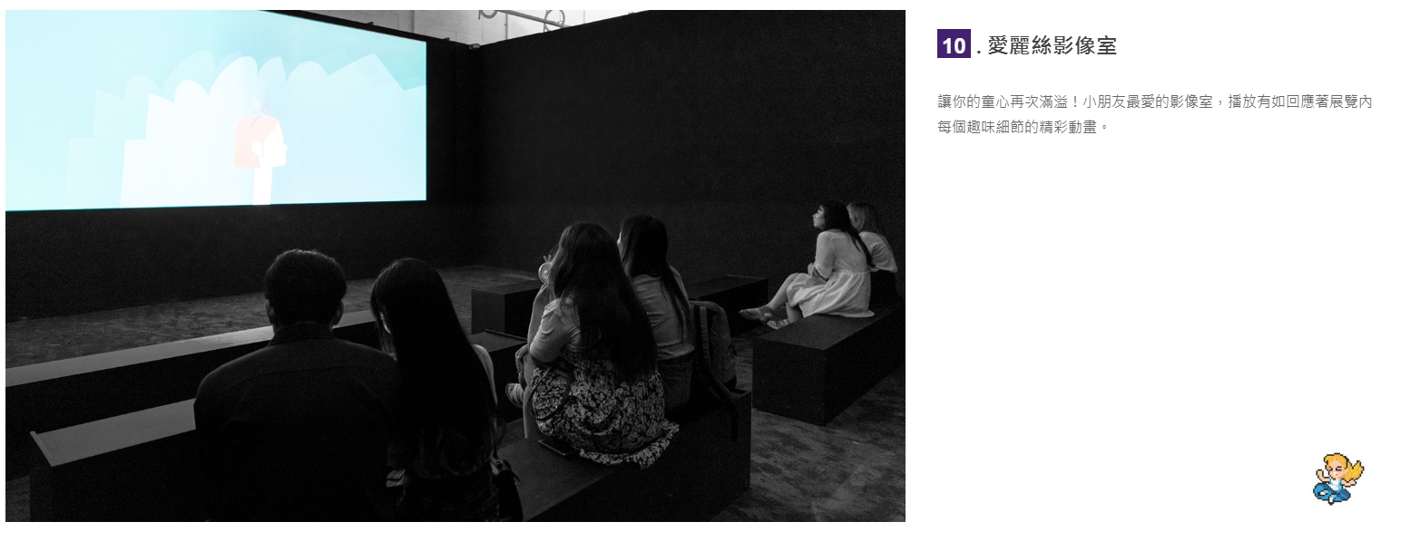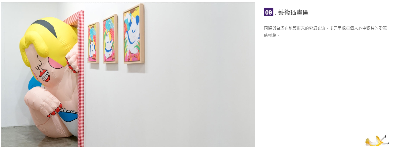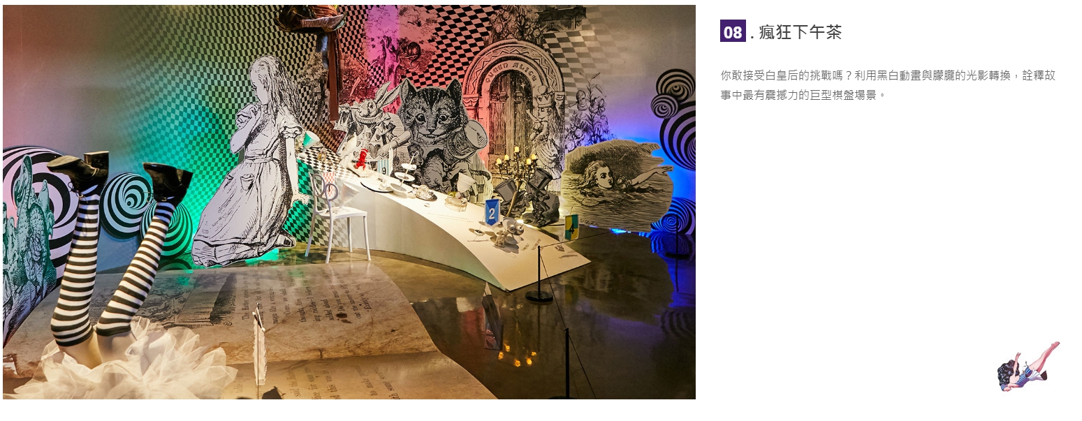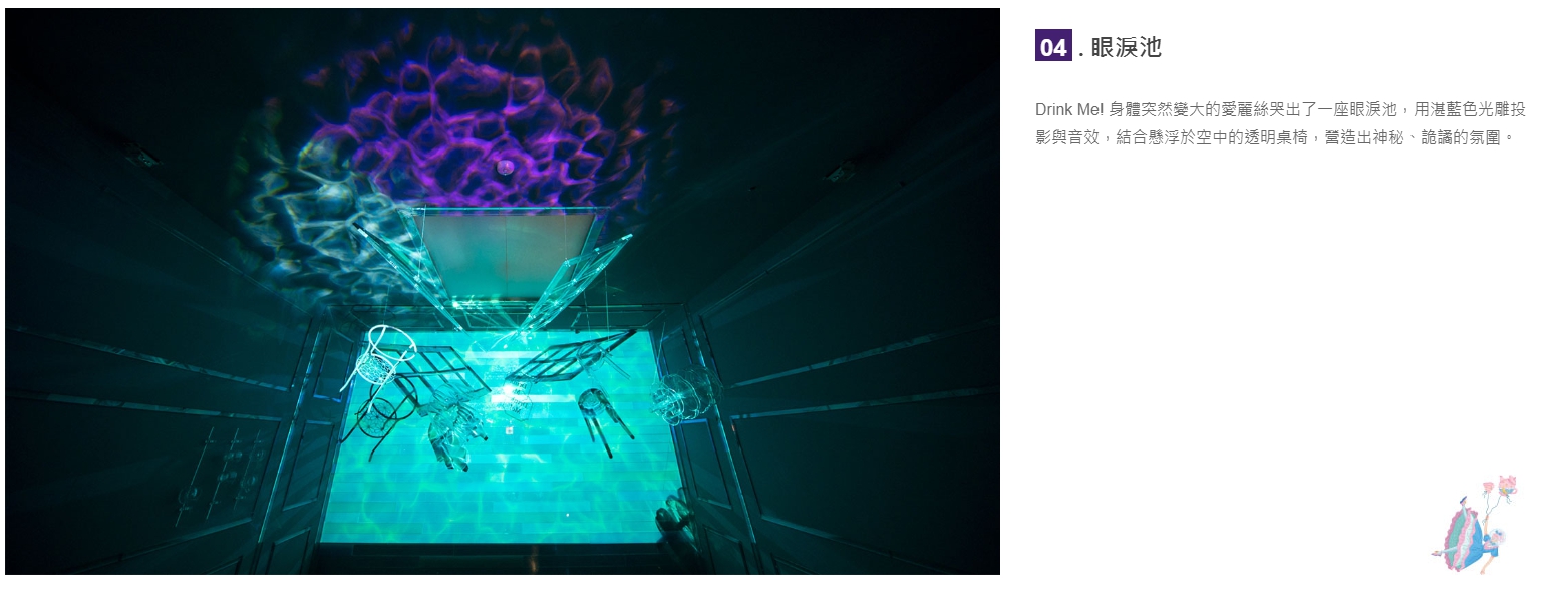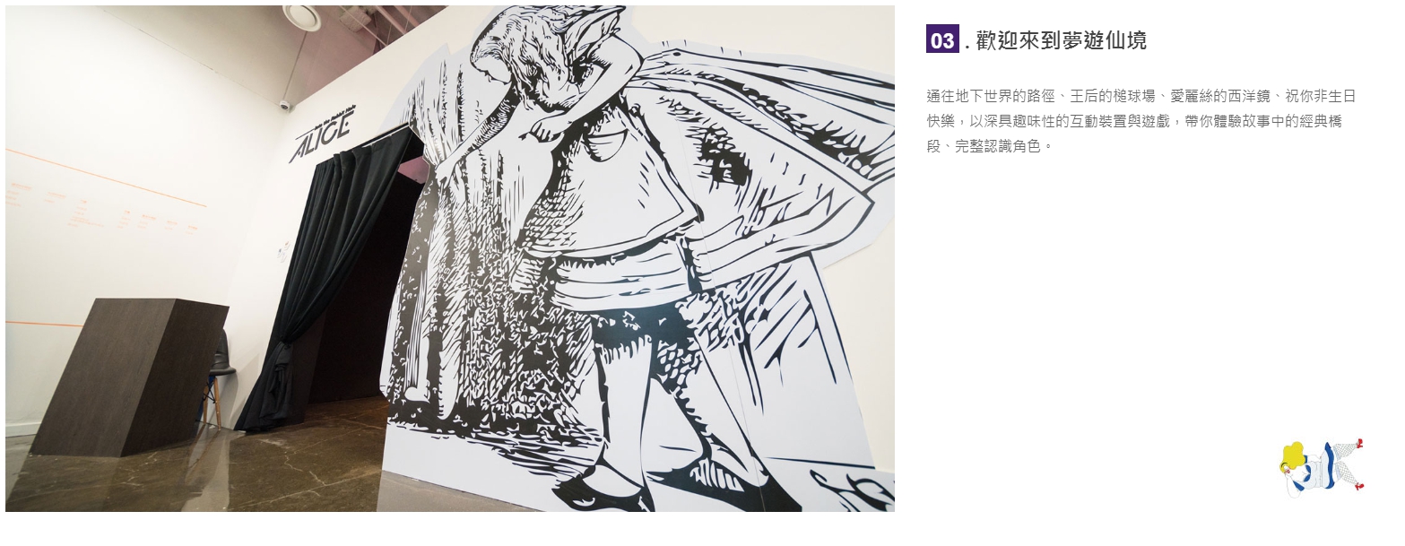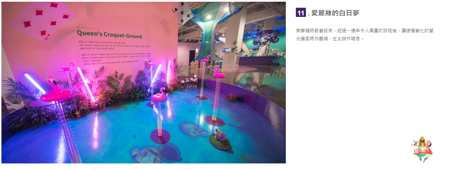 展覽內以數位影像重塑繽紛多彩的兔子洞、擁有浪漫擺設可自由穿梭躺臥的愛麗絲小屋、充滿神秘感的藍色光雕眼淚池、宛如在幻想與現實間穿梭的鏡屋,更有巨型棋盤劇場、高科技感的秘境森林等眾多經典故事場景,有趣、好拍又兼具教育意義,首爾開展期間每天有逾 6,000 條相片或影片上傳社交媒體,更吸引 BTS 防彈少年團、KARA、BLACKPINK 等當紅藝人偶像朝聖打卡。台北站將加碼展出台灣藝術家——貓王不討喜、張嘉穎等以愛麗絲為靈感的作品,勢必會碰撞出更多精彩火花。