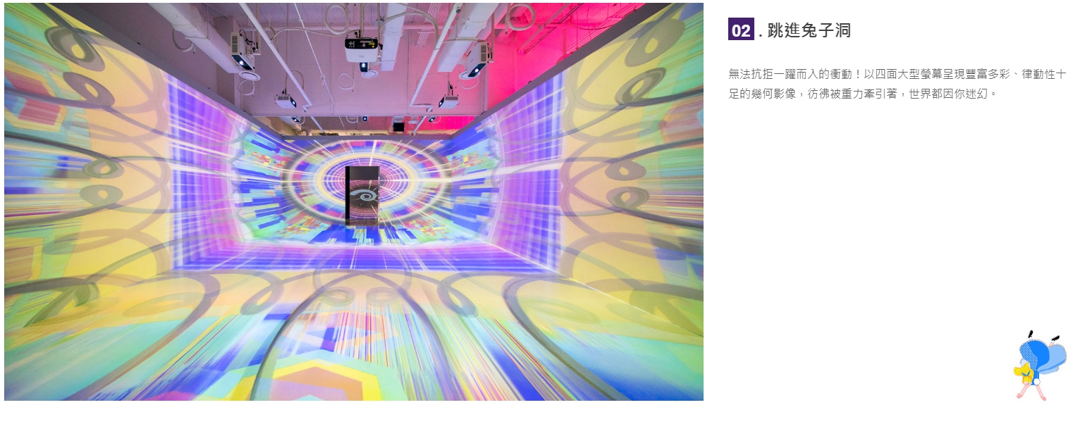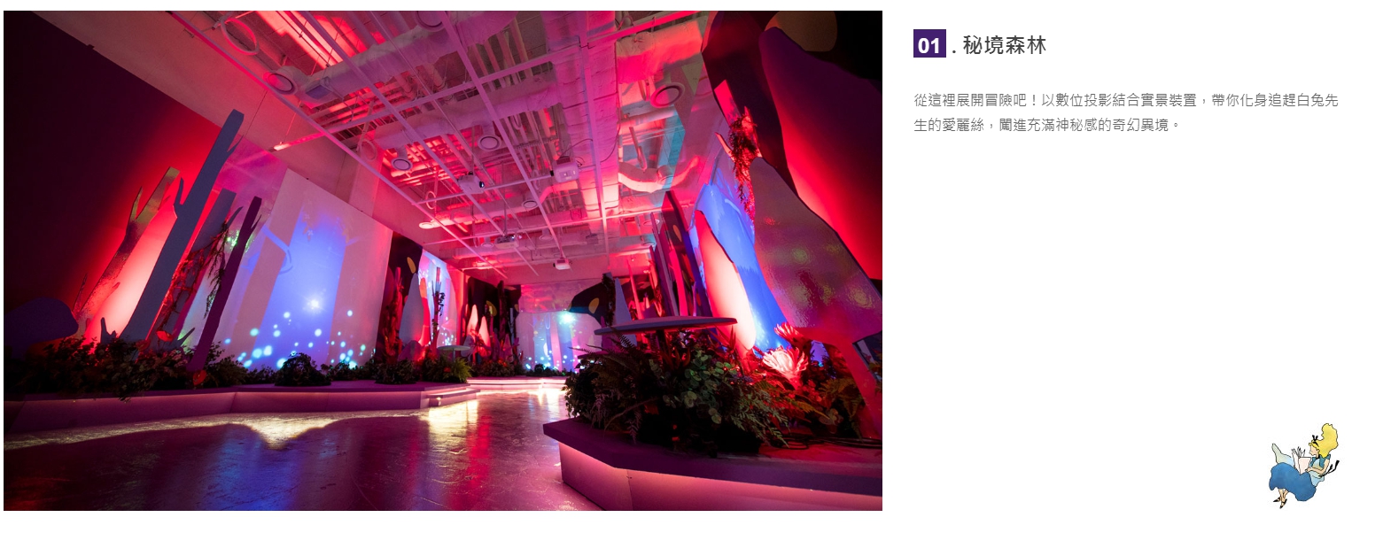 從韓國首爾出發,風潮席捲北京、杭州、上海與香港等城市,攻陷近百萬浪漫少女心與風格潮男的「跳進兔子洞—愛麗絲夢遊奇境體驗展」終於來台!集結超過 20 位新銳藝術家,運用大型視覺投影、燈光裝置與音樂設計等跨媒體創作形式,打造出 11 個不同風格的互動展區,讓觀眾化身為主角,展開超現實的童話之旅。