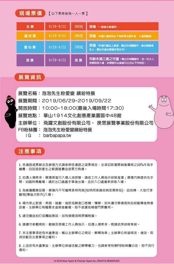 7.本展覽相關異動訊息公布或票務相關事宜,可隨時於泡泡先生粉愛變繽紛特展(臉書)查詢獲得第一手資訊,恕不另行通知