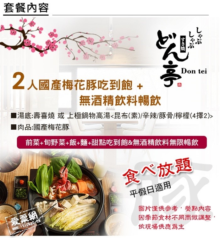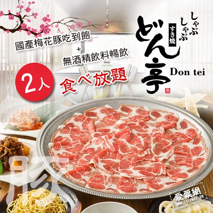 1.本券可2人於《どん亭Don-tei壽喜燒上極鍋物》享用國產梅花豚吃到飽+無酒精飲料無限暢飲乙次(不加收服務費)。
